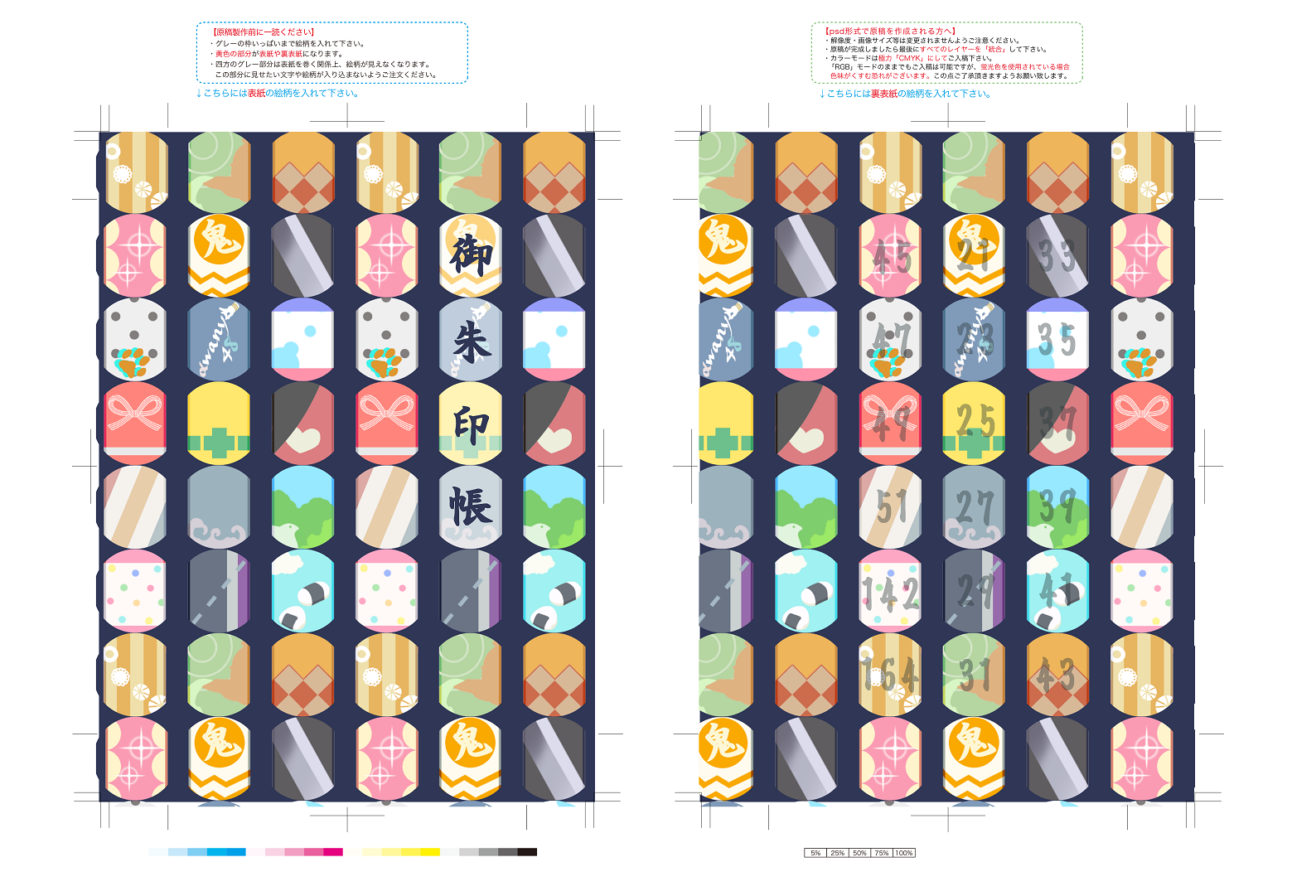 鬼丸だけ新規であとは風鈴柄から引っ張ってきました。粟にゃ柄よりこっちの方が持ち歩きやすいかなと。「御朱印帳」の文字が入ってる方が表、刀帳番号が振ってある方が裏(表紙)になる仕様です。完成サイズは18×12㎝で厚さ1.5㎝。
