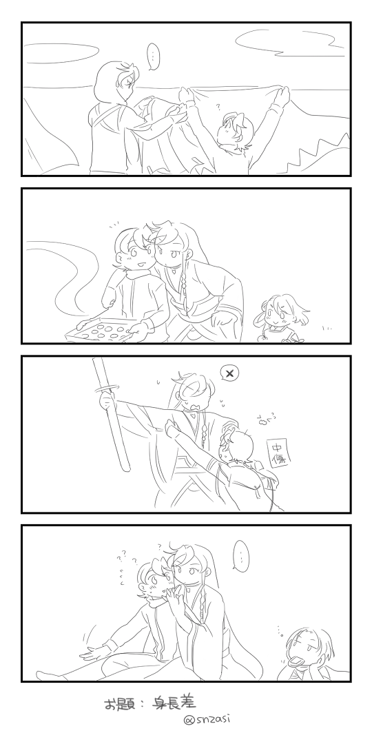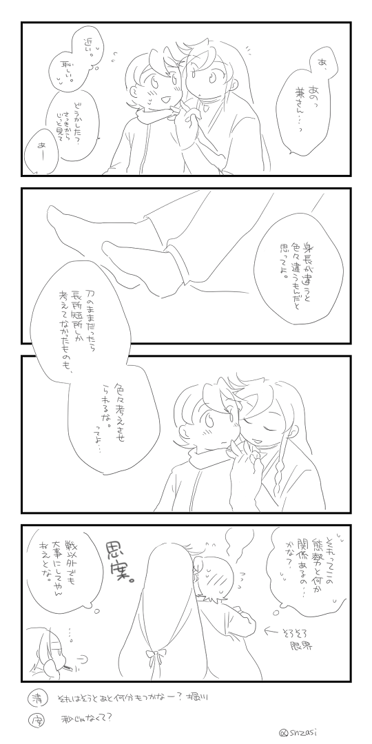 身長が違うって事は服のサイズも違うし目線合わせるのに屈まなきゃいけないし腕の長さというか手が届く範囲他諸々違うよね。刀の時は使いやすいかどうか程度しか気にしなくて良かったかもしれない程度の世界が、人の形を取ったことで一気に変わってくるね…ってのを言いたかったんです。人間味というか人間寄りに描いちゃうことが多いけど人外だっていうのを忘れたくなくて思い出したようにフラッとそういう感じのネタを持ってきてしまう。