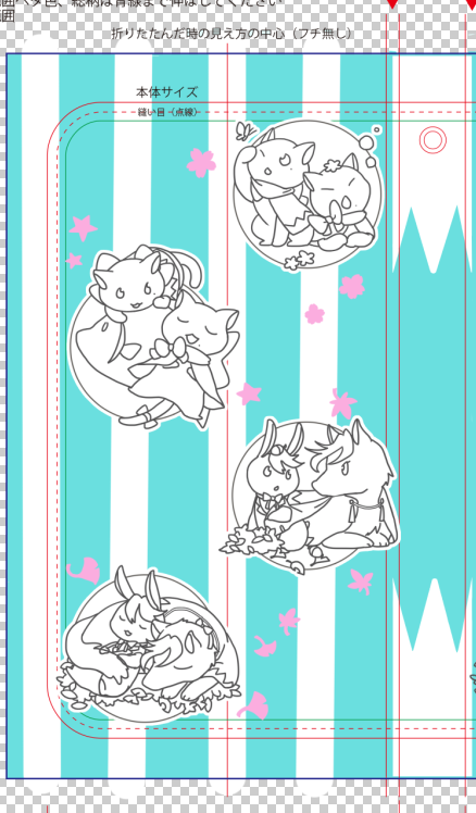 色味さえ気にしなければ新撰組とは誰も気付くまいて…な只の動物柄(に見える筈)。因みに印刷サイズ表示のスクショなのでこれがそのまま完成サイズになるんですが、私のスマフォ丁度これくらいのサイズなので完成したところで若干はみ出すんじゃないかな?orz あと言わなきゃ分からない上2つは沖田組、下は土方組の割り振りで曽祢さんどこー?ですが曽祢さんは上手くいけばストラップで付属です。