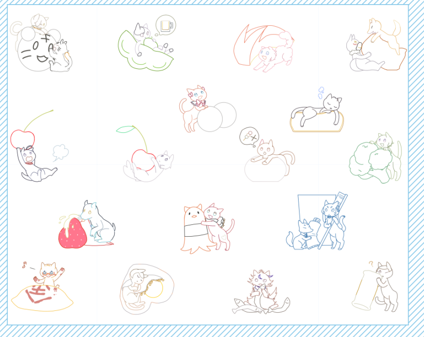 五虎退・鳴狐のお付とはちょっと違うので狐は小さめで付き添い的な感じにしました。一人だけ食べ物じゃないのも回想から来てます。この後線を色分けして着色して更に使いたいと思ってる原稿用にいじるという作業が待っててもう…_:(´ཀ`」∠):_ とは言え白山足すだけで行こうと頑張ってる時点でだいぶ楽はしてる筈なのでスパコミに間に合えばいいな。