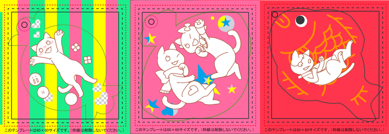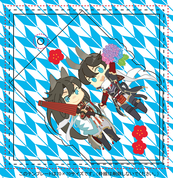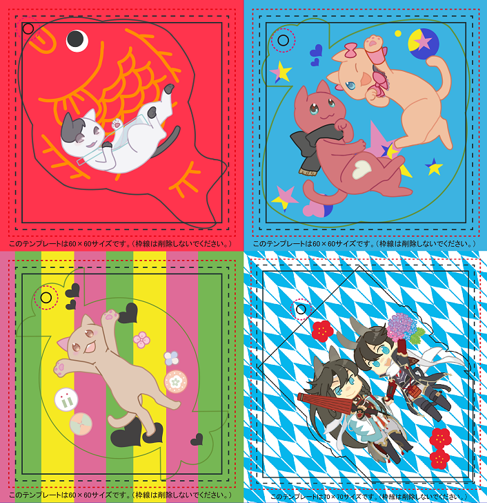 信乱の紺色部分・飴ちゃんのハート部分・土方組の白い矢羽部分は背景透過の為(きちんと形になれば)透けます。他、背景はフルプリントを考えて作成してるのでカットラインまで色が来ます。…こちらも無事に形になればの話ですが。と言うのも白版がきちんと作成できていないと不備で向こうに迷惑がかかってしまうという、この時期余計にやりたくない展開なので不安で不安でその度に言わずにはいられないというオチです。辛い_:(´ཀ`」∠):_