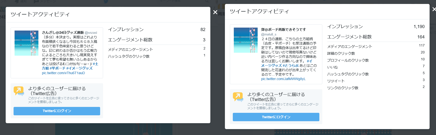ちょっと内容変えてツイートしてますがカモフラ垢の方が協力して下さってる方が大手+服飾サークルさんのため規模が違うんです_(:3 」∠)_ あと単純に本垢の方は「グッズを求めてる人が居ない」んです。土方組の絵やネタが見たいってだけでグッズは相手にされないし宣伝や告知に協力的な方がフォロワーに居ないし協力してもらったところでその先では需要が無いという現実。どう頑張っても手応えが違うので「向こう主力」言うのも仕方ないんです。