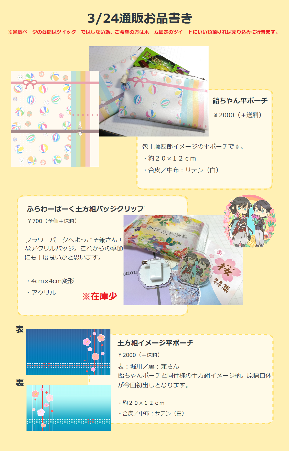 あとこちら2点(飴ちゃんポーチ・梅柄ポーチ)は24日夜8時から受付開始です。複数枚の購入が可能になっているのと、価格が送料を除いた額に変わっている点にご注意ください。土方組バッジクリップは別送・既に通販受付中です。宜しくお願いします~。