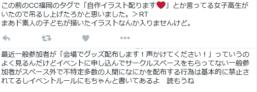 イベントで購入した服飾グッズを絵付きで感想垂れ流すこと数回、とても喜んでもらえてこちらも嬉しい反面、勢いでフォローして相互じゃない(非公開でのリスト追いが多いのでこちらはフォローしてない場合が多いんです;)と分かると外される…という展開に遭い、まあいつかこういう展開は来るだろうなあって予想はしてたんですが本当…。こっちはフォロワー増やしたくて公開してる訳じゃなく「気に入ってる物を図解でツイートしたい!このサークルさんこんな良いの出してるんだよ!」って言いたくてツイートしてるだけなので、逆にそういう対応されると予想してたというより見えていたとは言えなんか…何て言ったら良いか分からないけど、暗いものが心に影を落として傷付きます。(反対に相手もフォロワーかと思ってたら違うなんて!みたいに傷付いてるのかもしれないけど、RT可能・タグ利用もして販促やってるんだし自分所のフォロワーだけが買いに来るなんて事あっても稀だと思うんだわ。)